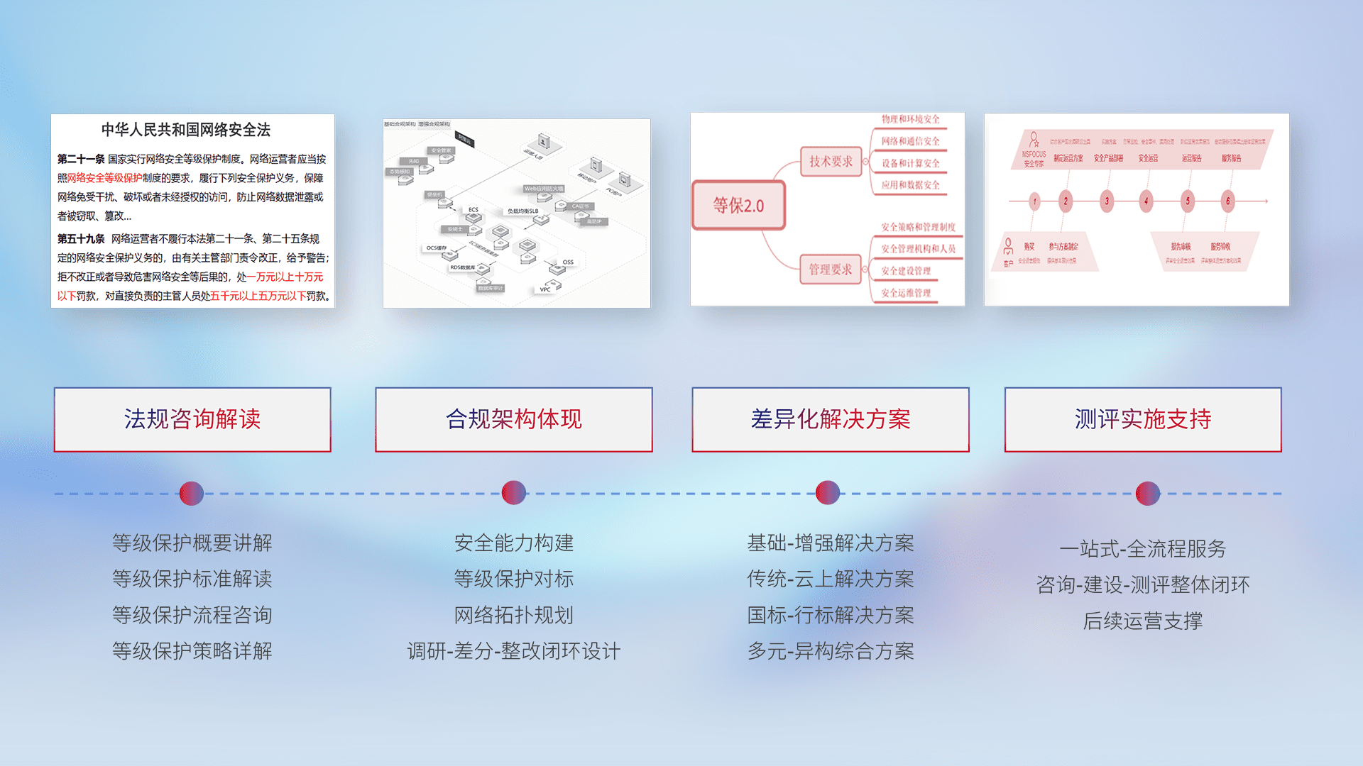 通过专业的法律咨询解读、、合规架构体现、、、差异化解决方案、、、测试实施支持等服务,,,,为客户量身打造等保合规体系。。。。